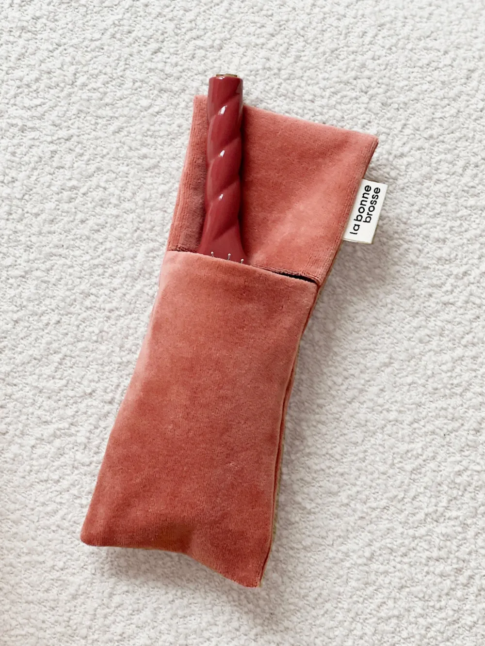 Difficile de se séparer de sa Bonne Brosse. Glissez-la dans sa pochette en velours et en satin pour l’avoir à portée de main ! D’une longueur de 26 cm, cette pochette pour brosse à cheveux trouvera facilement sa place dans votre valise ou votre sac à main.