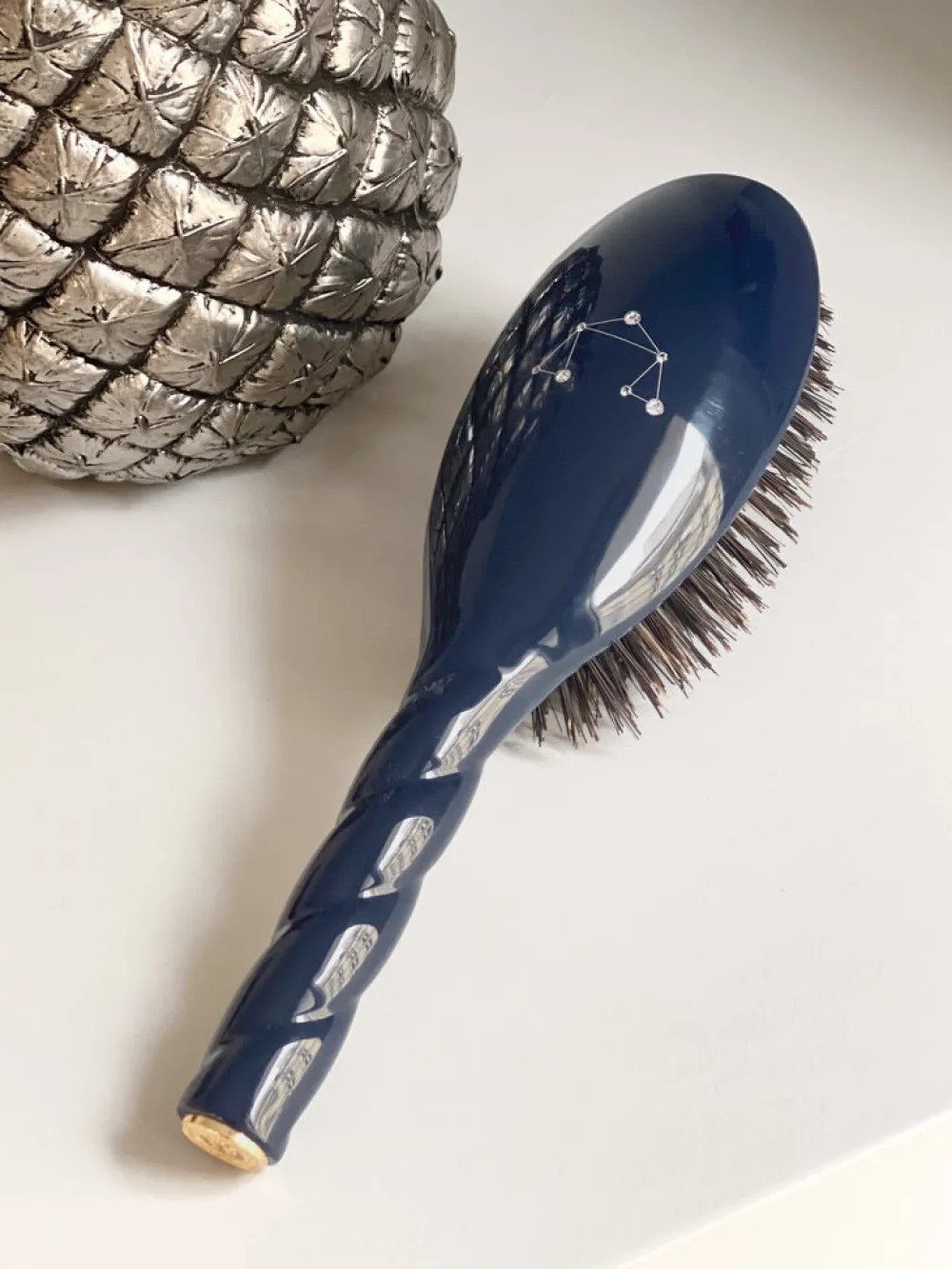Chaque brosse est minutieusement gravée à la main d’un dessin fin, représentant les étoiles de votre signe astrologique. Chaque pierre est ensuite chauffée et déposée une par une à la main par notre sertisseur pour obtenir un rendu unique. Un procédé artisanal et manuel qui font de ce nouvel objet un précieux outil de soin.