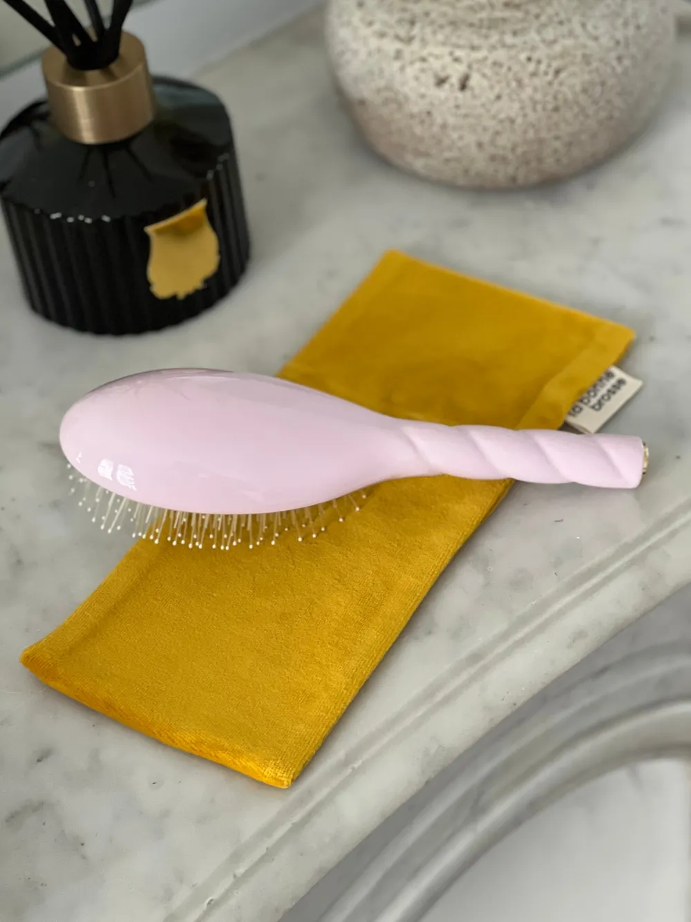 Sa taille a été pensée pour accueillir et protéger votre Bonne Brosse : ni trop grande, ni trop large, votre brosse à cheveux est en sécurité dans sa pochette et peut voyager partout avec vous !