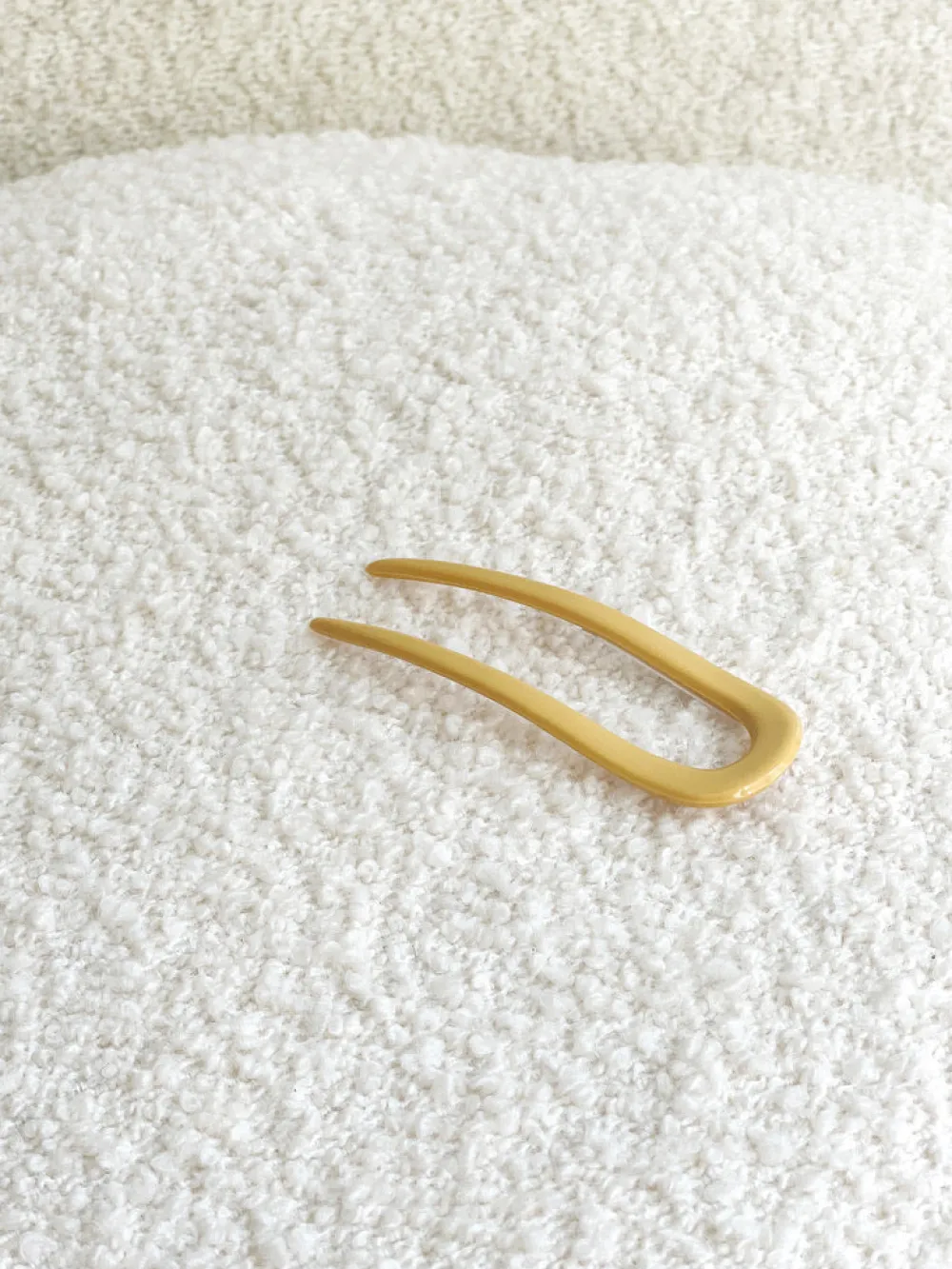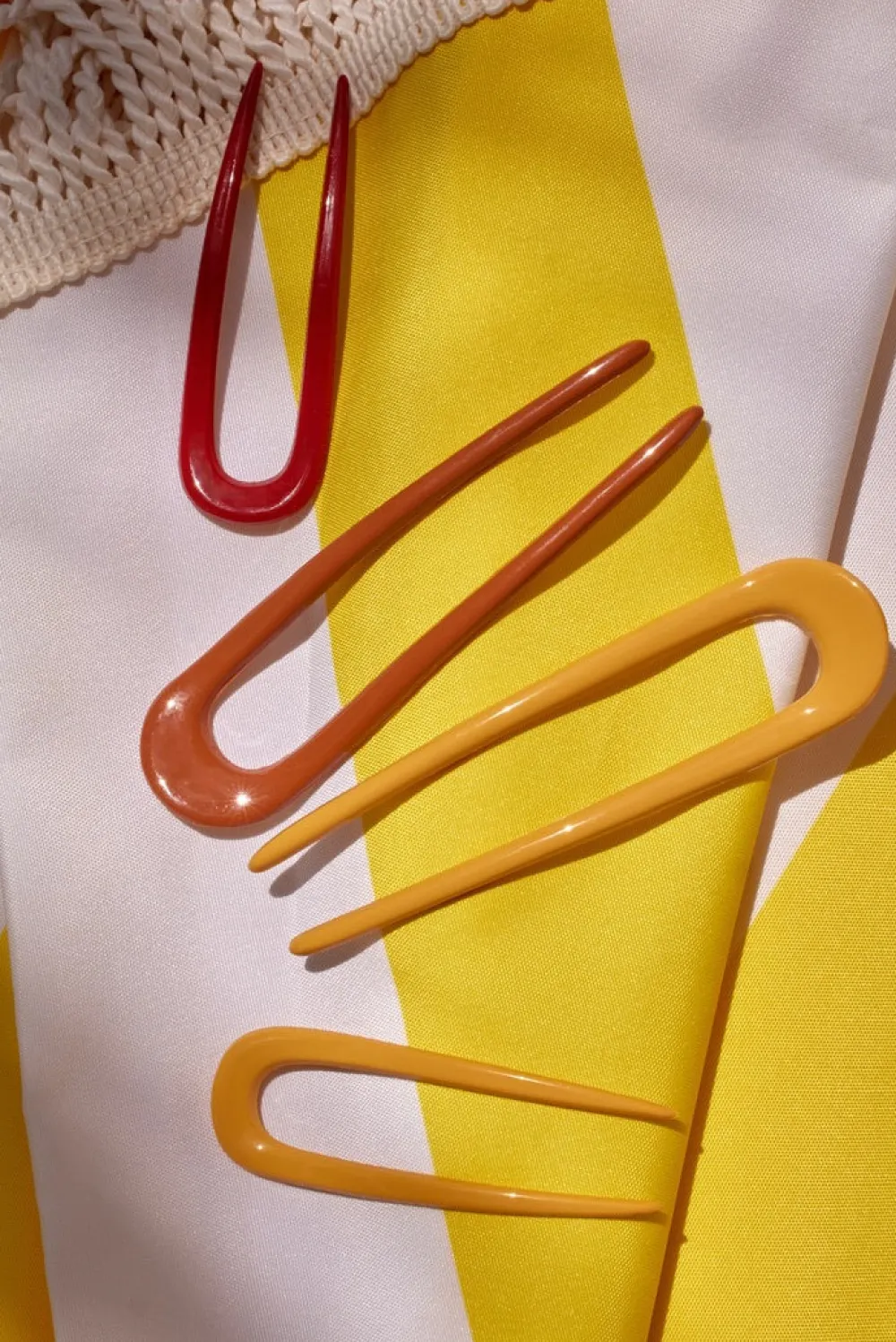 Nos pics à chignon en acétate de cellulose sont disponibles en trois coloris: Terre Battue, Jaune Safran et Terracotta. Ils s’accordent ainsi à tous les styles !